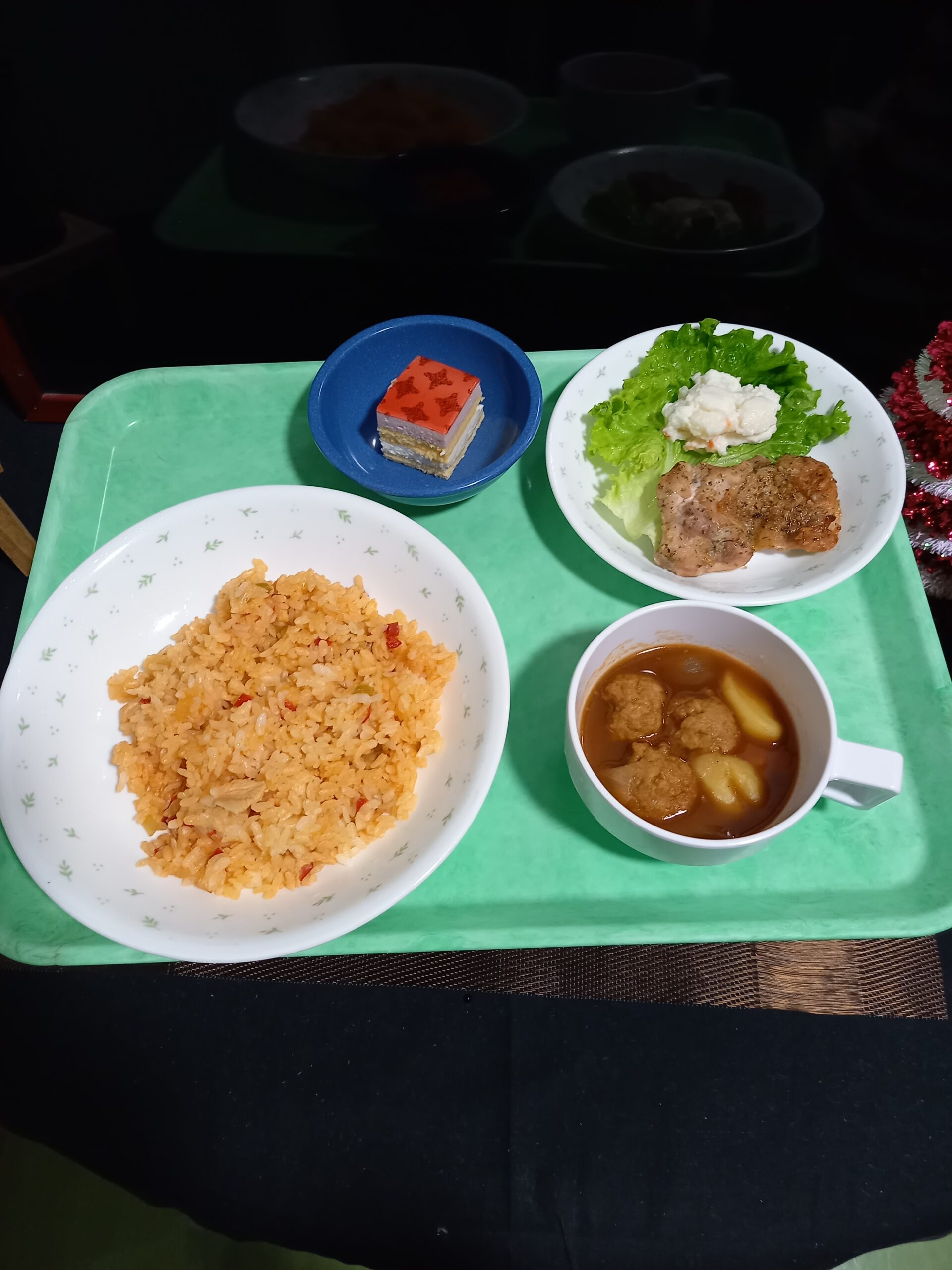 2025年12月25日 / 最終更新日時 : 2025年12月25日 ヴェラハイツ潮見 2025年師走、年の瀬となってきました。 2025年12月17日の夕食です。 チキンライス、ブラウンシチュー、鶏肉の香草焼き・付け合わせポテトサラダ、ケーキ右隅に、ちょこっとクリスマスツリーが映っているのが、見えますか? 特に今年の北海道は、例年に比べて早い時期から降り始め、大雪です。 先日は大吹雪で電線に積雪し、電話線が切れてしまって、お電話が繋がらなくなってしまいました。大自然の力を感じます。